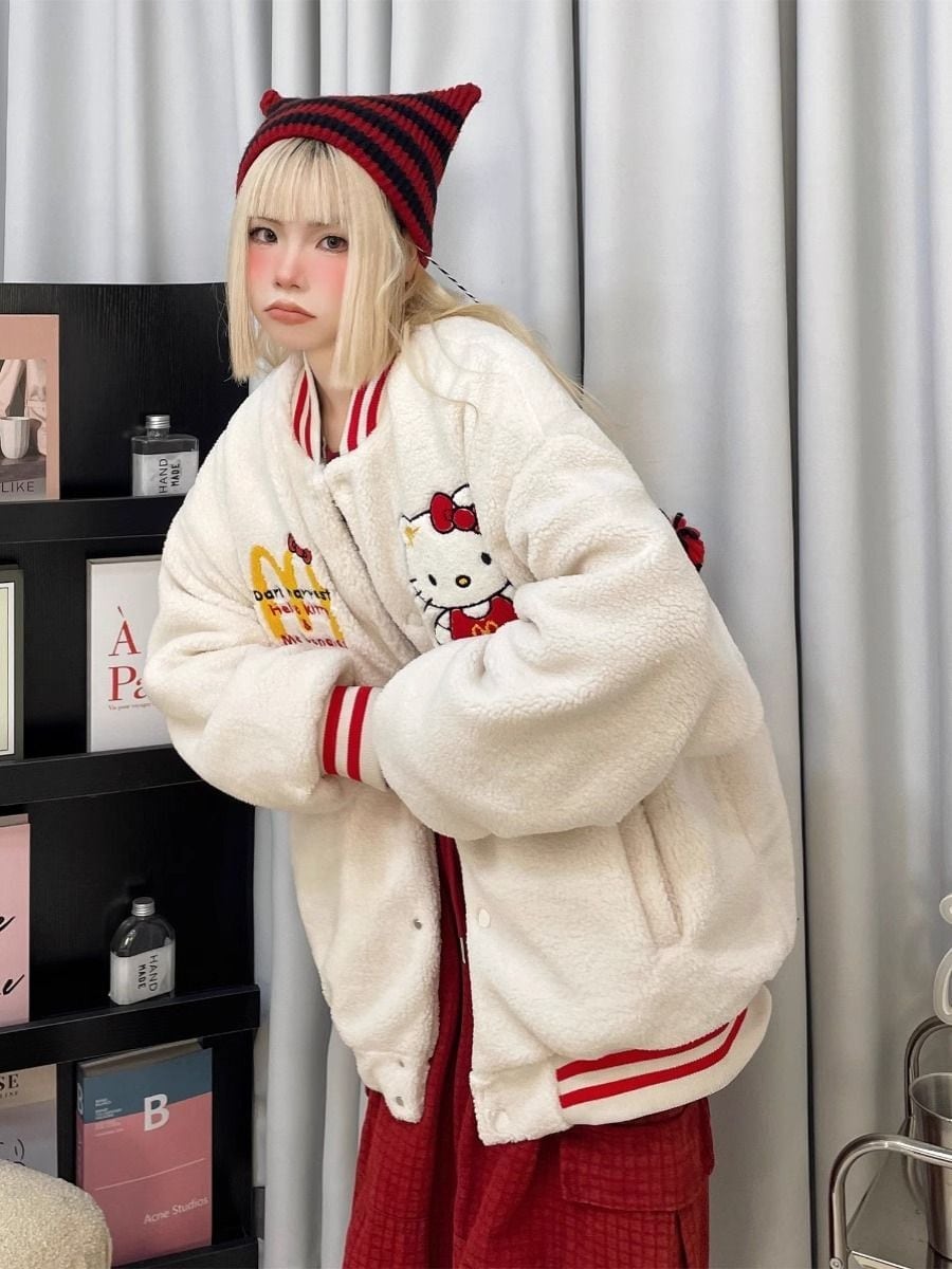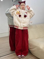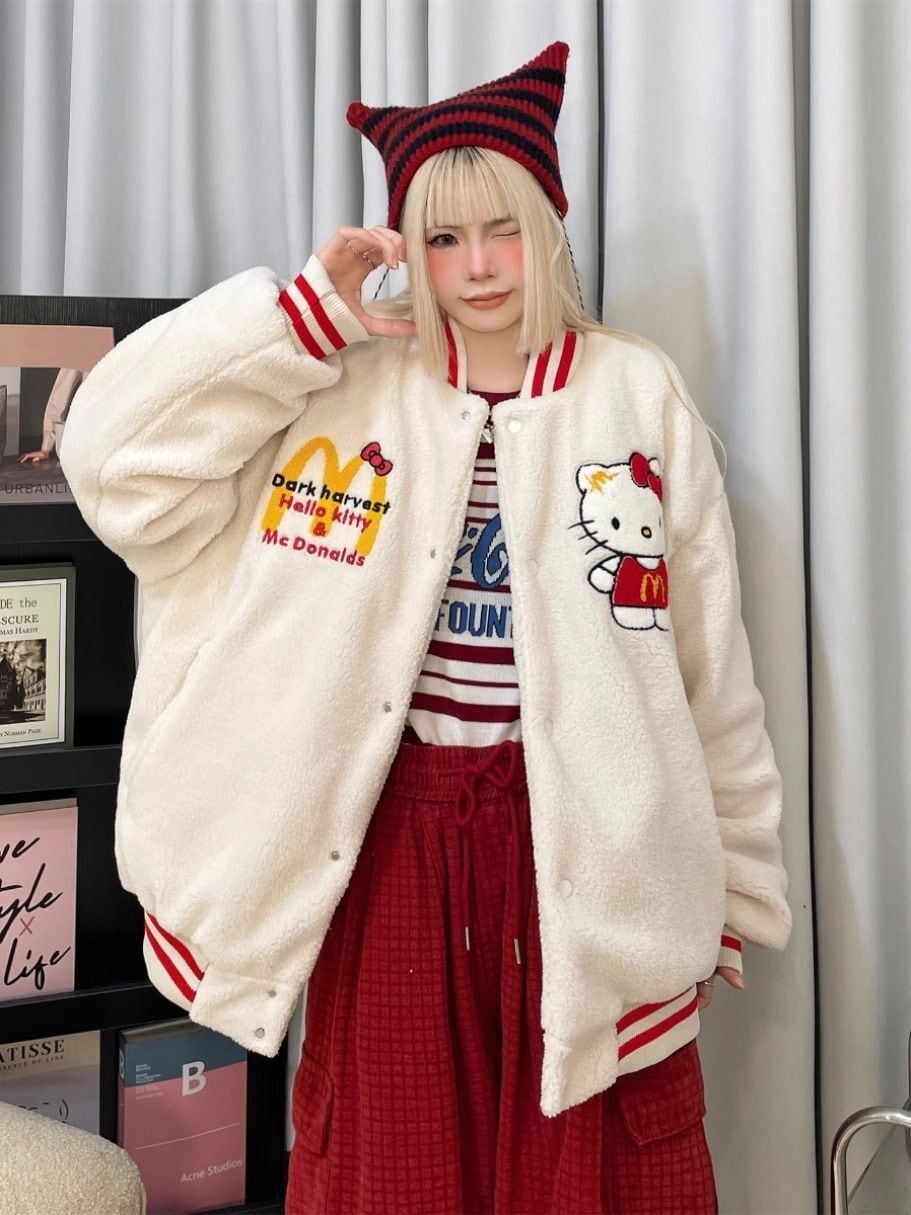 【裏起毛】刺?ロゴ厚手ゆったりボアジャケット トップス ホワイトスタジャン <S-4668>