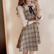 カレッジ風 レース切り替え ボータイ チェック柄 着せ 五分袖 ワンピース <S-1949>