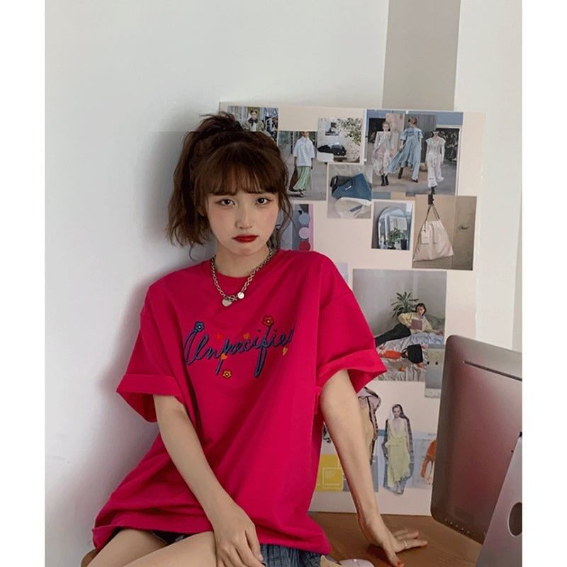 質感のいい アルファベット 刺ロゴ Tシャツ ローズ ゆったり半袖<S-2967>