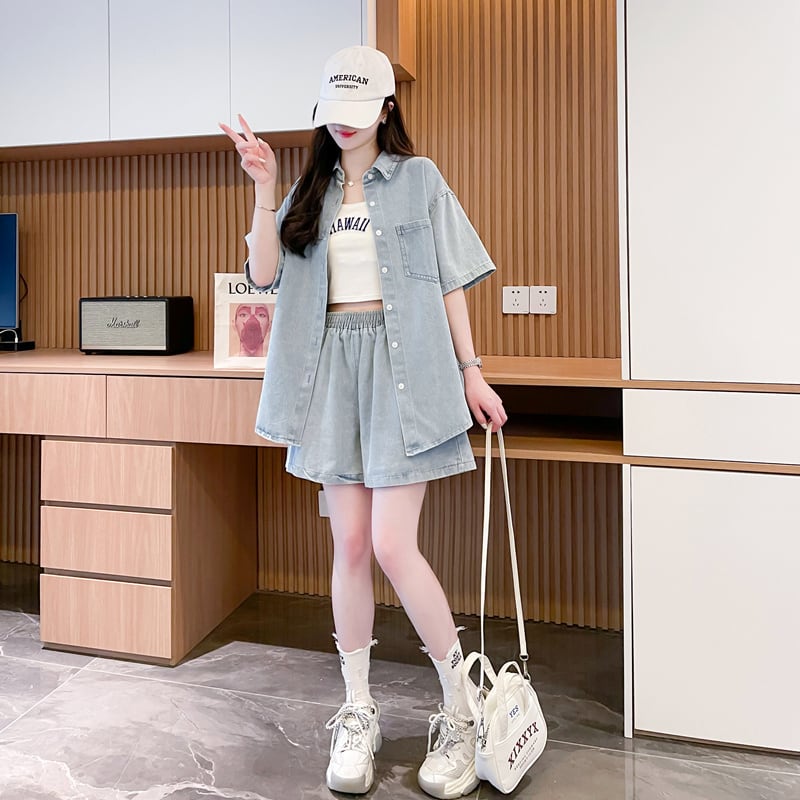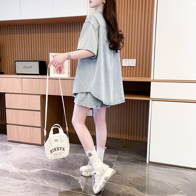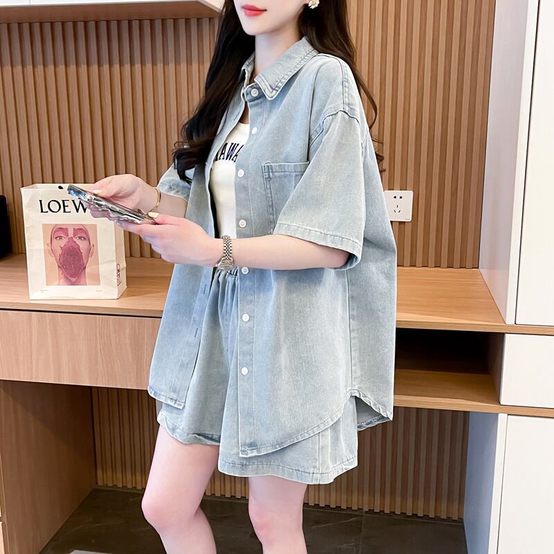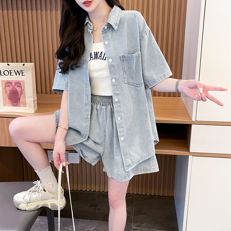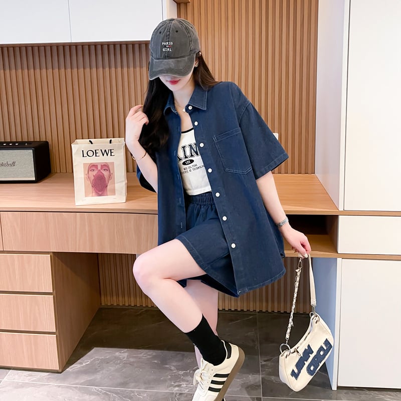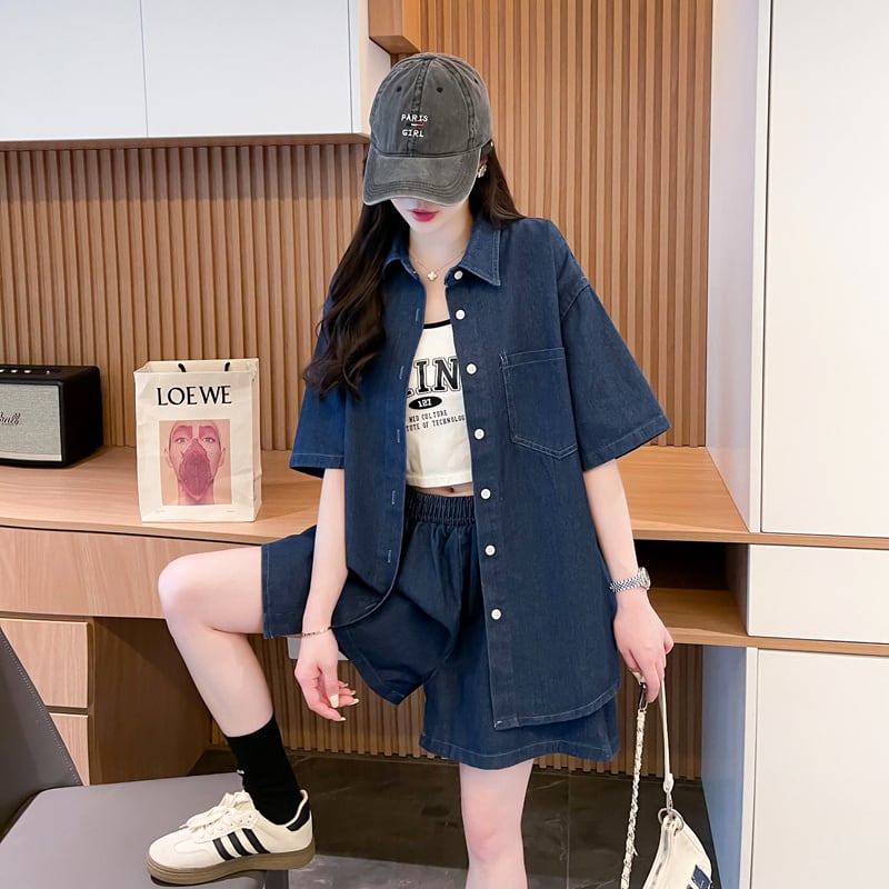 オーバーサイズ 半袖 デニム シャツ + ショートパンツ セットアップ <S-13150>