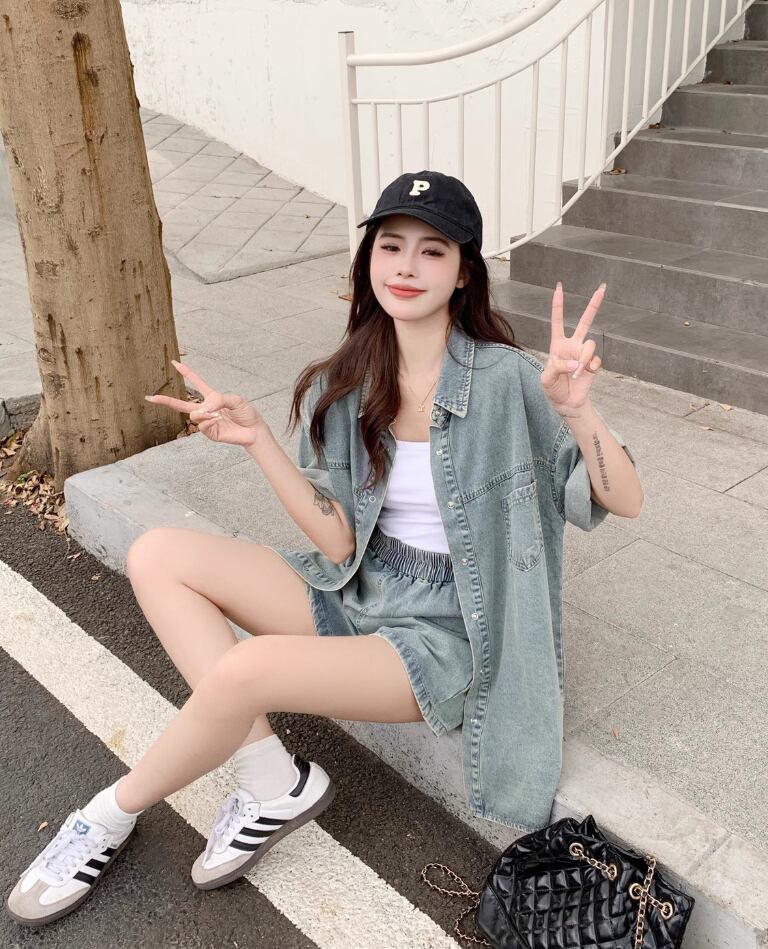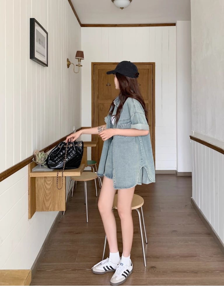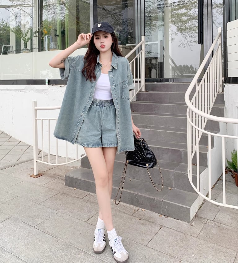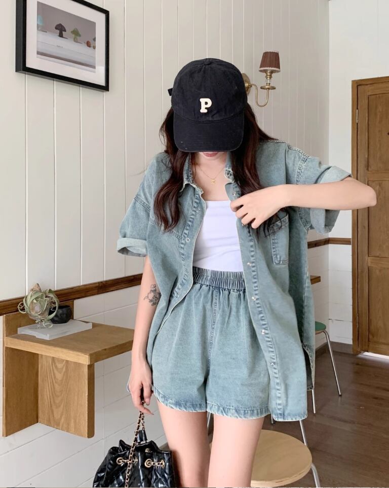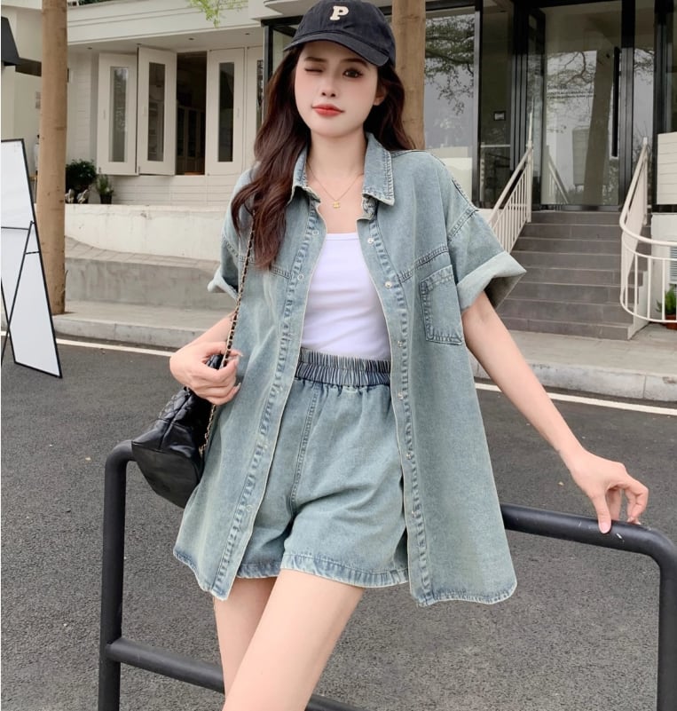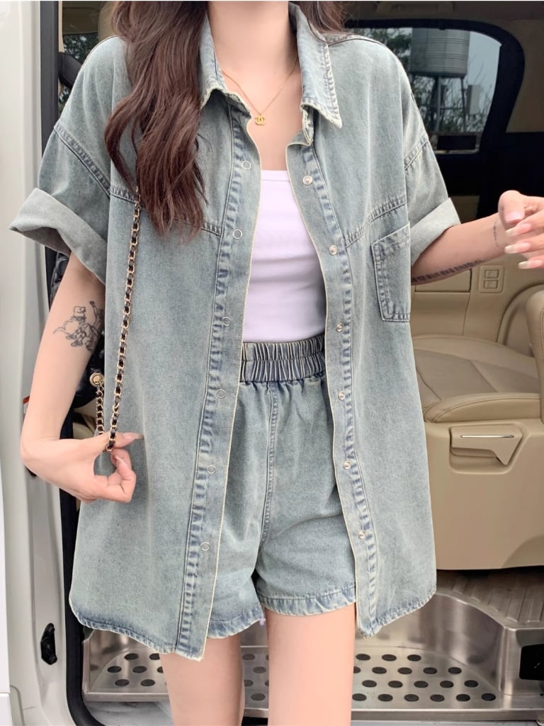 ルーズ 半袖 デニム シャツ + ショートパンツ セットアップ <S-13159>