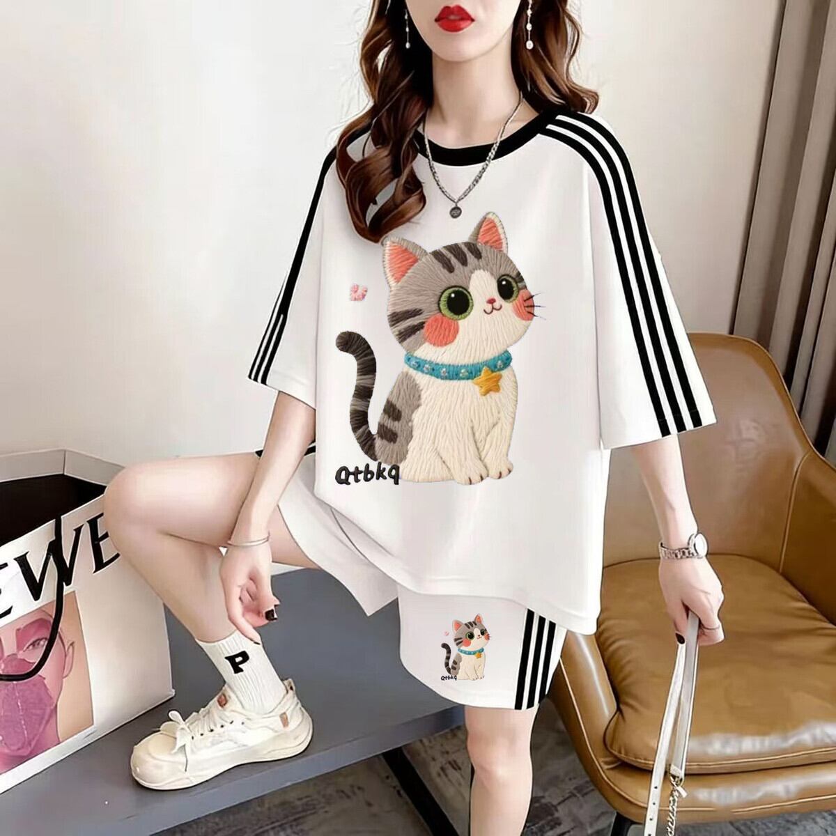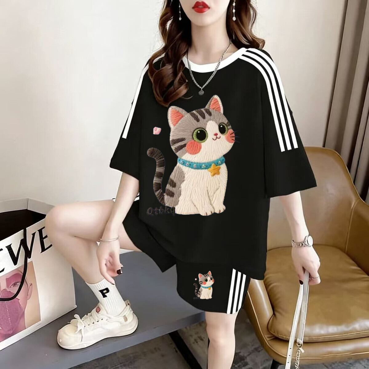 ルーズ レトロ プリント T シャツ + ショートパンツ セットアップ <S-13171>